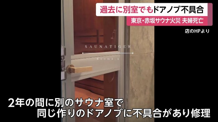 東京・赤坂の個室サウナで30代の夫婦が死亡した火事で、過去に、火事が起きたサウナ室のドアと同じような作りのドアノブに不具合が見つかり、修理をしていたことが分かった。