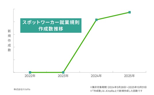 併せて、プラットフォーム各社でも規約や運用の明確化が進んでおり、契約成立タイミングや事業者都合キャンセル時の取扱い等を前提に、現場での手順・教育を規程とセットで整備する必要性が高まっています。現場では当日ミニ研修・危険作業の制限・割増計算の明確化まで含む規程と手順の平準化が加速しており、当社データでも「スポットワーカー就業規則」の作成数は前年比で増加しています。