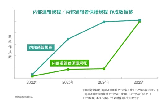 こうした流れを受け、匿名性を担保した第三者窓口の設置や、一定期間内に調査結果を通知する対応期限、通報者を特定し得る情報の守秘義務とログ管理を規程化する動きも広がっており、当社データでも「内部通報規程」、「内部通報者保護規程」の作成数はともに前年比で伸長しています。