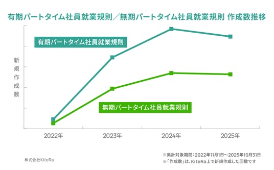 当社データでも、有期/無期パートタイム社員就業規則の作成は直近数年で増加が見られ、足元では高水準で推移しています。ガイドライン改定を契機に、待遇体系の点検と説明整理に着手する企業が増えることで、作成・見直しの動きが一段と強まっていくと考えられます。