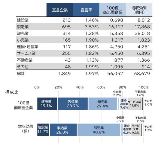 商流圏を業種別にみると、件数ベースでは「製造業」の1万6,112社が最多となったが、増収効果(額)では「卸売業」の2兆8,018億円が最大。「建設業」は、宣言企業自体は少ないものの、成長経営では欠かせない設備投資に関わる特性上、100億商流圏として多くの企業が恩恵を受けることも分かった。