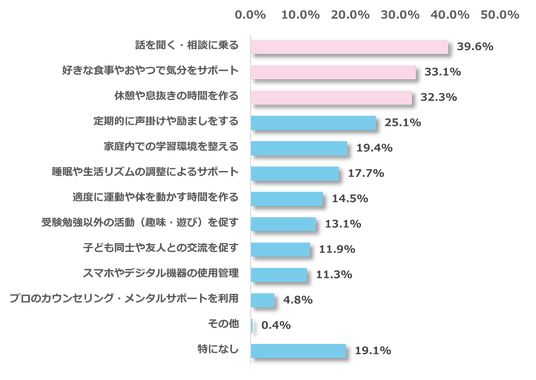 受験勉強中のメンタルケアとして実践していることについて調査したところ、最多回答は「話を聞く・相談に乗る(39.6%)」、次いで「好きな食事やおやつで気分をサポート(33.1%)」、「休憩や息抜きの時間を作る(32.3%)」と続きました。