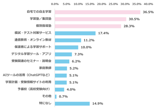 受験対策のために、利用している主なサービスや手段について調査したところ、最多回答は「自宅での自主学習(36.5%)」、次いで「学習塾/集団塾(30.5%)」、「個別指導塾(28.3%)」と続きました。