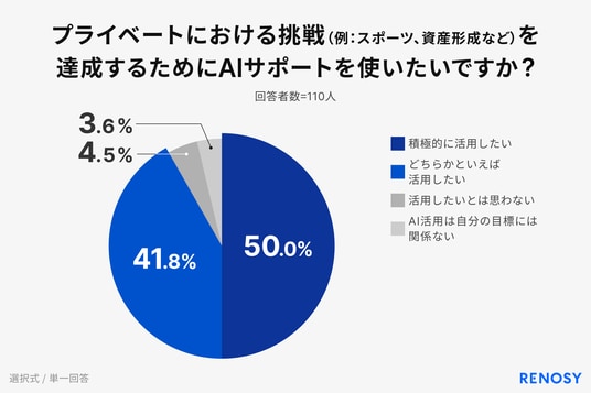 一方で、プライベートにおける「AI・データ活用技術の習得」以外の挑戦(スポーツ、資産形成など)を選んだ人に対して、その挑戦を達成するためにAIを使いたいか質問したところ、9割以上が活用したいと回答しました。