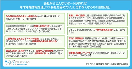 年末年始休暇を通じて「今の会社を辞めたい」と思った人に、会社からどのようなサポートがあれば気持ちが変わるかを聞いたところ、待遇面では「給与・ボーナスの増加」「福利厚生の充実」が目立ち、業務面では「業務負荷の均一化」「有休取得の容易化」や、「休暇明けは軽い業務から始める」といった意見も見られた。