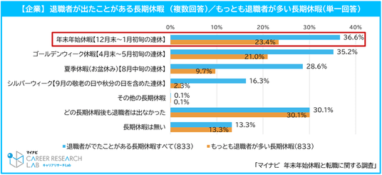 さらに「退職者がもっとも多かった長期休暇」をひとつ選んでもらったところ、「年末年始休暇(23.4%)」が最多で、次いで「ゴールデンウィーク休暇(21.0%)」、「夏季休暇(9.7%)」となり、企業にとって最も退職者が多い長期休暇は「年末年始休暇」となった。
