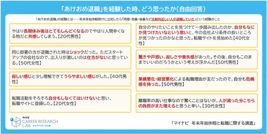 また、「あけおめ退職」を経験した際の感情について聞いたところ、「寂しい」「ショック」「驚き」といった感情に加え、「退職」という行動に対する共感や、「今よりも良い条件の職場を見つけている」「将来を考えて行動している」といった羨望に近い気持ちを示す回答も見られた。