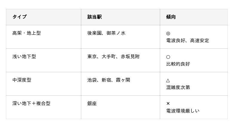 地下深度・駅構造・混雑度・基地局配置の4要素が通信速度を決めると考えています。