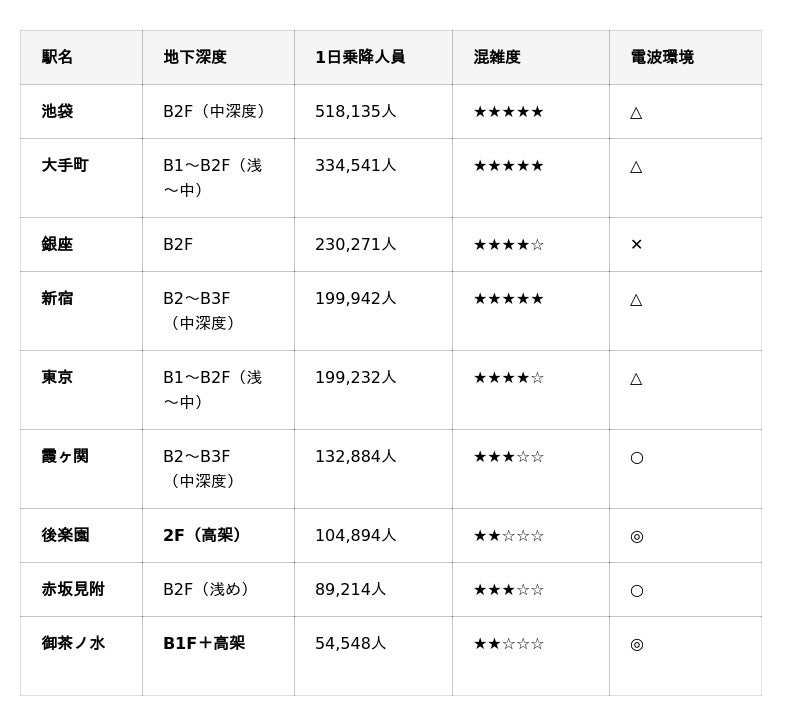 高架駅(後楽園・御茶ノ水)が上位、地下の複雑構造+混雑駅(銀座)が最下位。