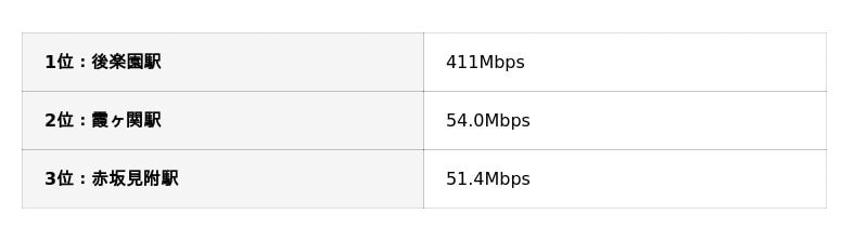 ・後楽園駅が最速(411Mbps):丸ノ内線で唯一の高架駅(地上2F)で電波減衰がほぼない