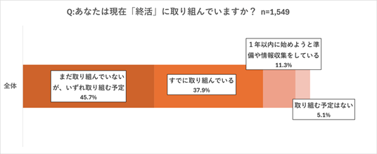 「終活」の現在の取り組み状況では、「まだ取り組んでいないが、いずれ取り組む予定」が45.7%ともっとも多く、「すでに取り組んでいる」は37.8%でした。「1年以内に始めようと準備や情報収集をしている」も11.3%と、いずれ取り組む人もあわせると、将来的に取り組む予定の人は57%でした。「取り組む予定はない」は5.1%でした。