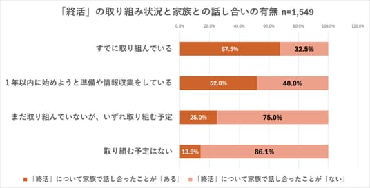 終活の現在の取り組み状況とあわせてみても、「すでに取り組んでいる」人でも、家族と話し合いをしたことが「ある」と回答したのは67.5%にとどまり、話し合いをしたことが「ない」という人は32.5%でした。「1年以内に始めようと準備や情報収集をしている」という人でも、家族と話し合ったことがある人とない人で、おおよそ半々に分かれました。