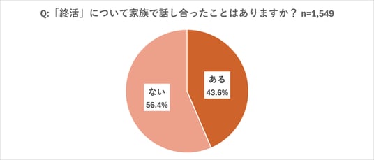 回答者のうち、終活について家族と話し合ったことが「ある」と答えたのは43.6%で、「ない」と回答した人は56.4%と半数以上にのぼりました。