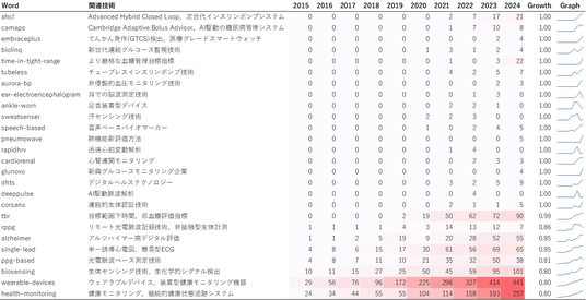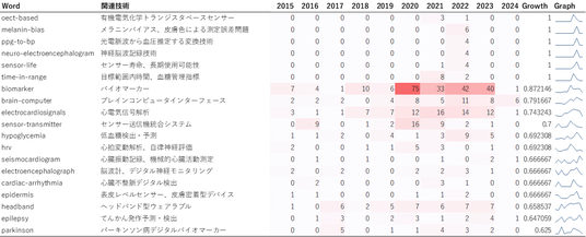 成長率上位には「心拍変動解析」、「連続血糖モニタリング」、「非侵襲的センシング技術」に関するキーワードが多く出現していることが読みとれます。その中からとくに注目のキーワードを紹介します。