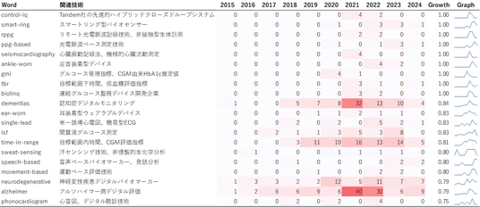 これらのキーワードの急伸は、測定精度の向上、測定の公平性確保、より実用的な健康管理指標の開発など、デジタルバイオマーカーが実用化段階に入りつつあることを示しています。