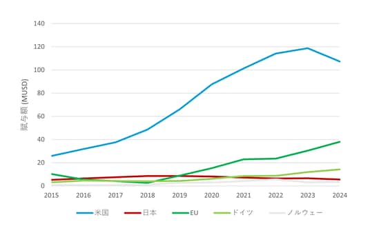 グラント件数では米国が最多ですが、日本も一定数が確認されました。賦与額では米国が圧倒的に多く、EUが増加傾向にあります。日本のグラント数については、内閣府の戦略的イノベーション創造プログラム(SIP)、科学技術振興機構(JST)の未来社会創造プログラム、日本医療研究開発機構(AMED)による支援が継続されていることが要因です。