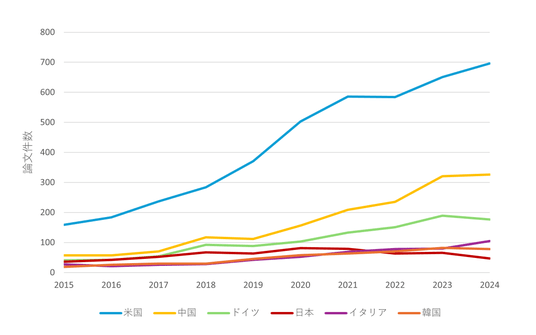 図4:デジタルバイオマーカーに関連する論文の国別出版件数の年次推移