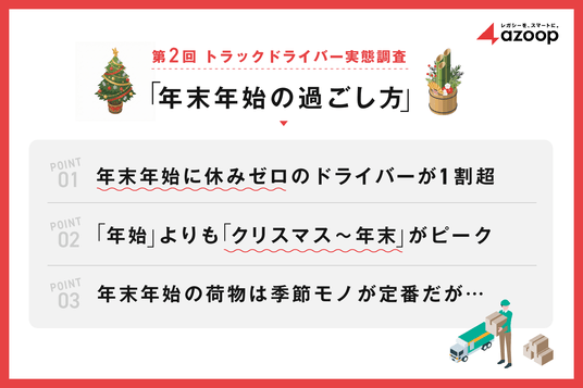 株式会社Azoop、第2回トラックドライバー実態調査「年末年始の過ごし方」を実施。年末年始も働くドライバーの14.2%が「休みゼロ」、「クリスマス~年末」が繁忙期。