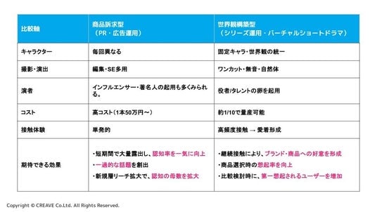このように、ショートドラマ市場は 「世界観構築型(シリーズ運用・VSD)」と「商品訴求型(PR・広告運用)」 の二つに明確に分岐し始めており、企業の目的に応じて選択すべきアプローチが大きく異なります。世界観構築型は長期のブランド認知形成に優れる一方、商品訴求はほとんど行わないため、短期的成果を求める施策には適しません。反対に、商品訴求型のショートドラマは明確なプロモーション効果が期待できますが、シリーズ運用によるIP形成とは異なる目的構造を持ちます。