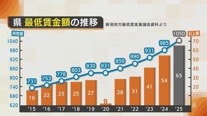 企業が労働者に最低限支払わなければいけない最低賃金。2025年度の最低賃金引き上げ額の幅は全国で63~82円となった。最低賃金の全国加重平均額は1121円で、2024年度の1055円から66円増加。10月2日から新潟県でも最低賃金の改定額1050円が適用された。ただ、働く人や企業など、最低賃金を取り巻く現場の実情はそれぞれ違うようだ。
