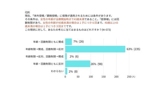 現在、「体外受精/顕微授精」に保険が適用されるためには、女性の年齢が治療開始時点で43歳未満であること、「胚移植」には回数制限があり、女性の年齢が40歳未満の場合は1子につき6回まで、40歳以上43歳未満の場合は1子につき3回までです。この現状に対して、63%の人が“年齢制限は賛成”、“回数制限は反対”と回答しました。「保険適用後の不妊治療に関するアンケート2022」(2022年)(*1) 調査では「年齢制限・回数制限ともに反対」が42%でしたが、近年は回数制限について改善の声が根強いことが明らかになりました。
