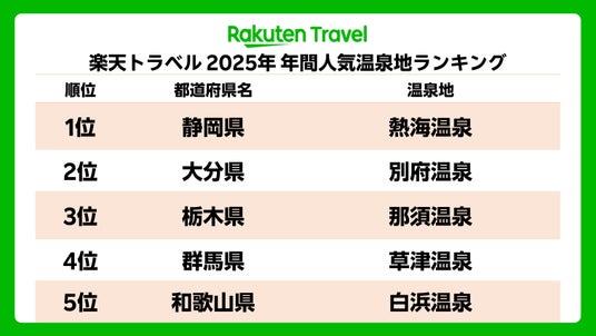楽天グループ株式会社が運営する旅行予約サービス「楽天トラベル」は、「楽天トラベル 2025年 年間人気温泉地ランキング」を発表しました。1年間の延べ宿泊者数を温泉地ごとにランキングした結果、12年連続で静岡県「熱海温泉」が1位、大分県「別府温泉」が2位を獲得しました。