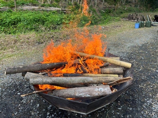 中村ブレイス駐車場での放置竹林の炭化作業の様子