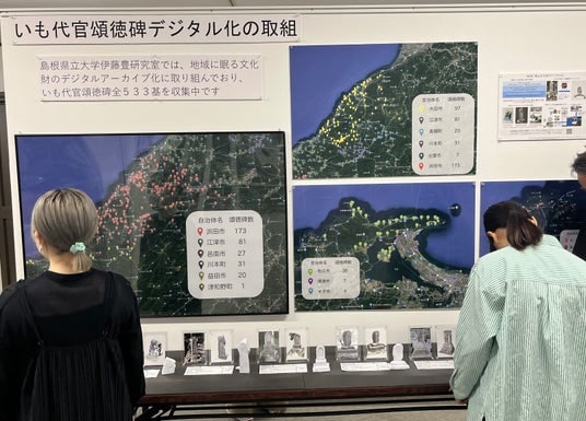 その功績は、現在も地域に残る頌徳碑に刻まれています。学生たちは、大田市文化協会が提供した位置情報データを基盤に、県内外で約530基確認されている頌徳碑を対象として、調査および3Dアーカイブ化に取り組みました。