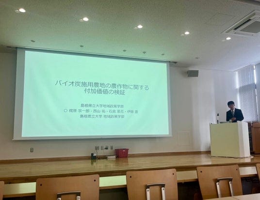 学生有志は、島根県大田市大森地区において、放置竹林を原料として製炭したバイオ炭を農地に施用し、作物栽培に取り組みました。あわせて、炭素貯留量を国の制度に基づき算定・申請した結果、1トン分のCO2削減(Jクレジット)の認証を取得しました。2025年、本クレジットは島根トヨペット株式会社へ寄付され、現在は同社とともに、その環境価値を具体的にどのような形で地域へ還元するか、具体的な用途についての検討・協議を進めています。単なる「譲渡」で終わらせず、活用方法の検討プロセスまでを学生が企業と共有する点も本活動の特徴です。