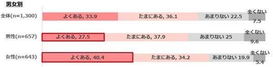 「よくある」は、男性の28%に対して女性は40%。