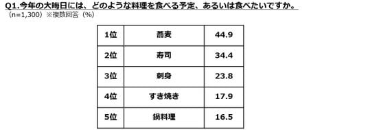 正月三が日のメニューでは、「寿司」、「餅」、「刺身」が上位です。