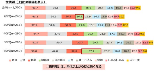 ・正月に食べるものは、「寿司」「餅」「刺身」がTOP3。4位の「鍋料理」は、年代が上がるほど高くなる。