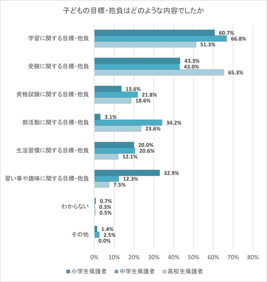 また、小学生保護者は「習い事や趣味に関する目標・抱負」が、中学生保護者では「部活動に関する目標・抱負」が、それぞれ他よりも高い傾向にあることが分かった。