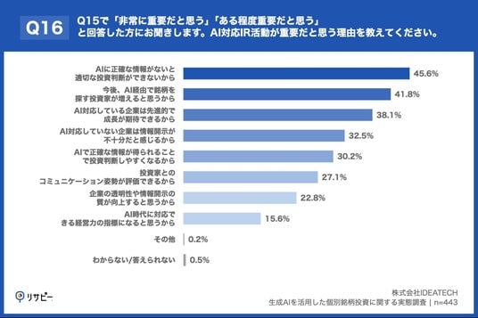 「Q16. Q15で「非常に重要だと思う」「ある程度重要だと思う」と回答した方にお聞きします。AI対応IR活動が重要だと思う理由を教えてください。(複数回答)」(n=443)と質問したところ、「AIに正確な情報がないと適切な投資判断ができないから」が45.6%、「今後、AI経由で銘柄を探す投資家が増えると思うから」が41.8%、「AI対応している企業は先進的で成長が期待できるから」が38.1%という回答となりました。