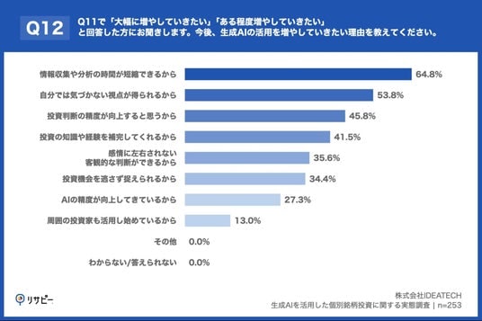 「Q12. Q11で「大幅に増やしていきたい」「ある程度増やしていきたい」と回答した方にお聞きします。今後、生成AIの活用を増やしていきたい理由を教えてください。(複数回答)」(n=253)と質問したところ、「情報収集や分析の時間が短縮できるから」が64.8%、「自分では気づかない視点が得られるから」が53.8%、「投資判断の精度が向上すると思うから」が45.8%という回答となりました。