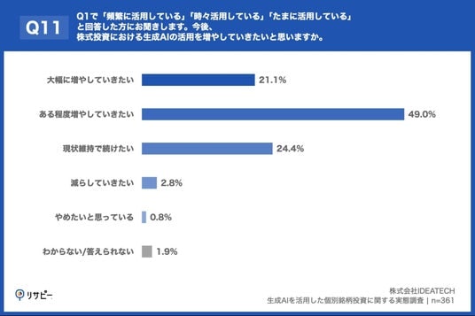 「Q11. Q1で「頻繁に活用している」「時々活用している」「たまに活用している」と回答した方にお聞きします。今後、株式投資における生成AIの活用を増やしていきたいと思いますか。」(n=361)と質問したところ、「大幅に増やしていきたい」が21.1%、「ある程度増やしていきたい」が49.0%という回答となりました。