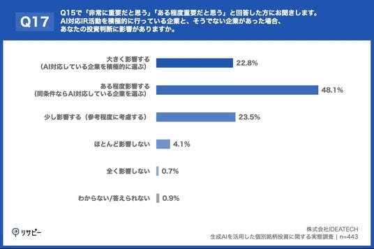 「Q17. Q15で「非常に重要だと思う」「ある程度重要だと思う」と回答した方にお聞きします。AI対応IR活動を積極的に行っている企業と、そうでない企業があった場合、あなたの投資判断に影響がありますか。」(n=443)と質問したところ、「大きく影響する(AI対応している企業を積極的に選ぶ)」が22.8%、「ある程度影響する(同条件ならAI対応している企業を選ぶ)」が48.1%という回答となりました。