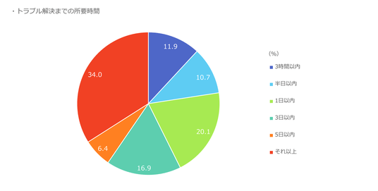 トラブル発生後、18.1%はサービス復旧の「時間に関係なく利用しない」と回答しています。サービス復旧まで10分以上を要した場合に利用をやめるとした回答者は24.1%に上り、3時間以上を要した場合のこの割合は54.3%に拡大します。「時間に関係なく利用しない」を合わせると、トラブル発生から3時間以上の経過で、実に7割以上が利用をやめていることになります。一方で、トラブル発生時に問い合わせをした際、解決までに要した時間で「3時間以内」と回答した割合は11.9%、「1日以内」と回答した割合でも半数に満たない42.7%でした。ユーザーが求める対応速度と実際の解決に要する時間に大きな乖離(かいり)があることが伺えます。