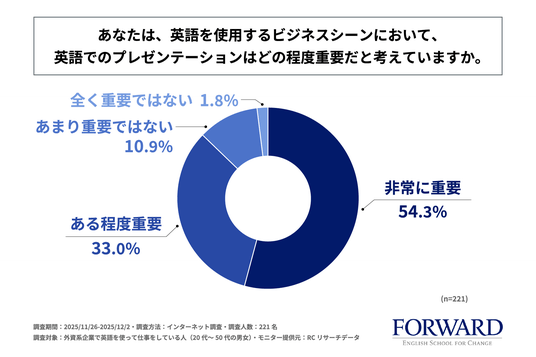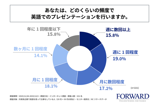 外資系企業や海外との取引が増加している現代において、自身の強みや提案を英語で効果的に伝えるプレゼンテーションスキルへの注目が高まっています。 一方で、実際に外資系企業で働く人々が英語でのプレゼンテーションをどのように認識し、どのような課題に直面しているのか、その実態は十分に解明されていません。 そこで「FORWARD」は、外資系企業で英語を使って仕事をしている人を対象に、「ビジネスにおける英語でのプレゼンテーションに関する調査」を実施しました。