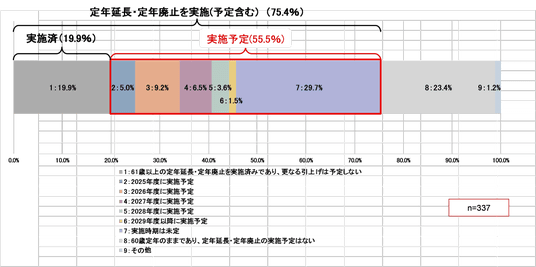 ●定年延長予定は、「実施済」19.9%と「実施予定(時期未定含む)」55.5%の合計で75.4%を