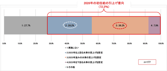 ●さらに、「2025年を下回る水準」を含めると、賃上げ同様初任給の引き上げ意向も7割を超える
