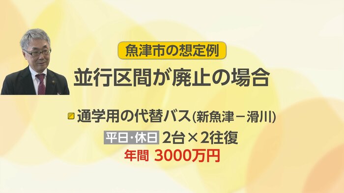魚津市も並行区間の存続・廃止について慎重に検討するとしており、仮に廃止となった場合は通学用の代替バスとして新魚津―滑川間を年間3000万円で運行できるとの試算を住民に示している。