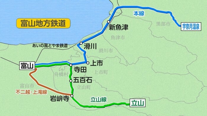 富山地方鉄道の鉄道線には3つの路線がある。電鉄富山から黒部市の宇奈月温泉へ走る「本線」、立山駅へ向かう「立山線」、富山市内を中心に走る「不二越・上滝線」だ。「立山線」と「不二越・上滝線」は国の支援制度を活用し維持する方針が決まっているが、「本線」については未定のままである。