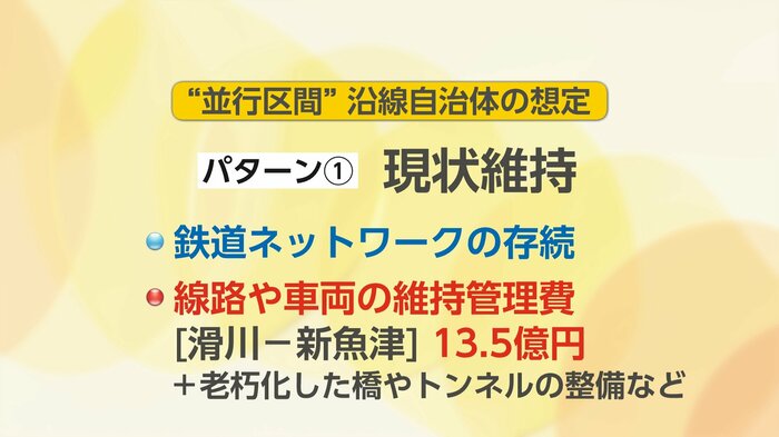 1つ目は現状維持。沿線住民にとっては歓迎だが、線路や車両の維持管理費として並行区間だけで10年間で13億円あまりかかるとされている。さらに、滑川市と魚津市の境にある早月川にかかる地鉄の鉄橋は完成から90年近くが経ち、老朽化が進んでいる。これらの橋の更新などを見積もると、費用はさらに膨らむ。
