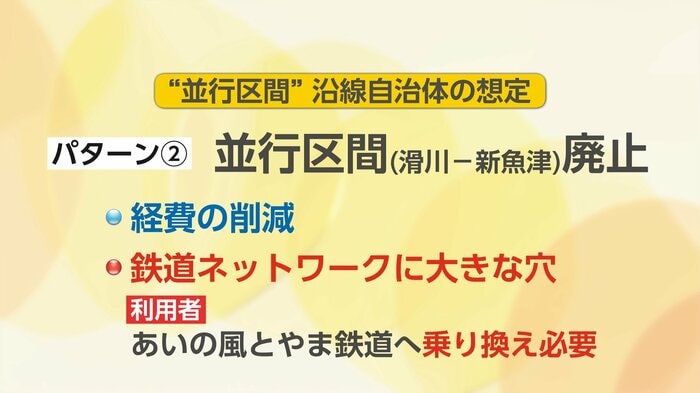 2つ目は、「滑川―新魚津」の並行区間を廃止する案だ。その分、費用は抑えられるが鉄道ネットワークには大きな穴が空き、利用者はあいの風とやま鉄道への乗り換えが必要になる。約8.5キロの区間に地鉄は7つの駅があるが、あいの風鉄道は3つしかなく、地域からあいの風の駅までを結ぶバスなどの代替手段が必要となる。