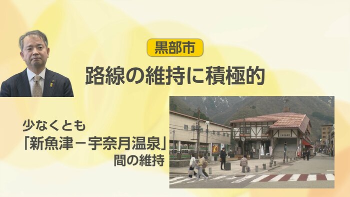 一方、黒部市は路線の維持を訴えている。地鉄の本線は宇奈月温泉と電鉄富山を1本で結ぶため、仮に並行区間を廃止する場合でも、あいの風とやま鉄道への乗り換えをスムーズにできるようにすること、またあいの風の車両が地鉄の線路に乗り入れ、宇奈月温泉まで運行する形を検討してほしいとしている。