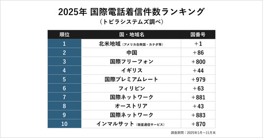トビラシステムズの調査で、2025年に国内への着信件数が最も多かった国際電話は、国番号が「+1」で始まるアメリカ合衆国やカナダなどの北米地域の番号でした。