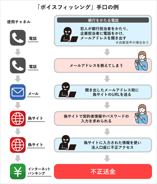 ◯自動音声と偽サイトを組み合わせたボイスフィッシングの増加金融機関や宅配事業者などを名乗る自動音声電話を入り口に、メールやSMSで偽サイトへ誘導し、銀行口座情報や認証コードなどを盗み取る手口です。