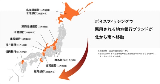 近年は法人を狙うボイスフィッシングが増えており、「口座情報の更新手続きが必要」などの自動音声電話を入り口に、偽のログイン画面へ誘導してインターネットバンキングの情報を盗み取る手口が発生しています。盗み取られた情報をもとに、法人の口座へ不正アクセスされ、多額の資金が不正送金されるケースもあり、被害額が数億円規模に及ぶ深刻な被害が確認されています。さらに、地方銀行をかたるケースも各地で増加しており、北陸での発生を起点に南下するような広がりも見られます。