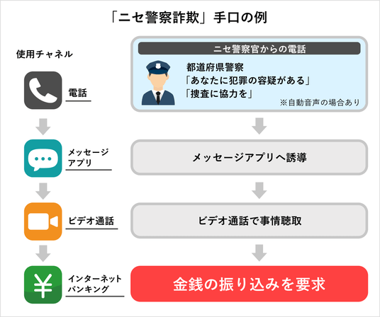 ニセ警察詐欺は、警察官をかたる人物から電話がかかってきて、「あなたに犯罪の容疑がかかっている」「身の潔白を証明するためには資産の調査が必要」などと不安を煽り、金銭などをだまし取る手口です。かつてのオレオレ詐欺では、子や孫など親族をかたる手口が主流でしたが、現在は警察官を名乗る手口へと変容し、さらに複数チャネルを使う高度な詐欺へと進化しています。